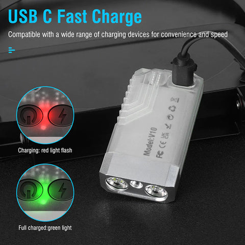 Afraid of the dark?: Use our V10 compact powerful flashlight, the main light has 5 modes, the maximum 1000 lumens, and the irradiation distance is 100 meters; and the flashlight is small in size and light in weight (less than 50 grams).